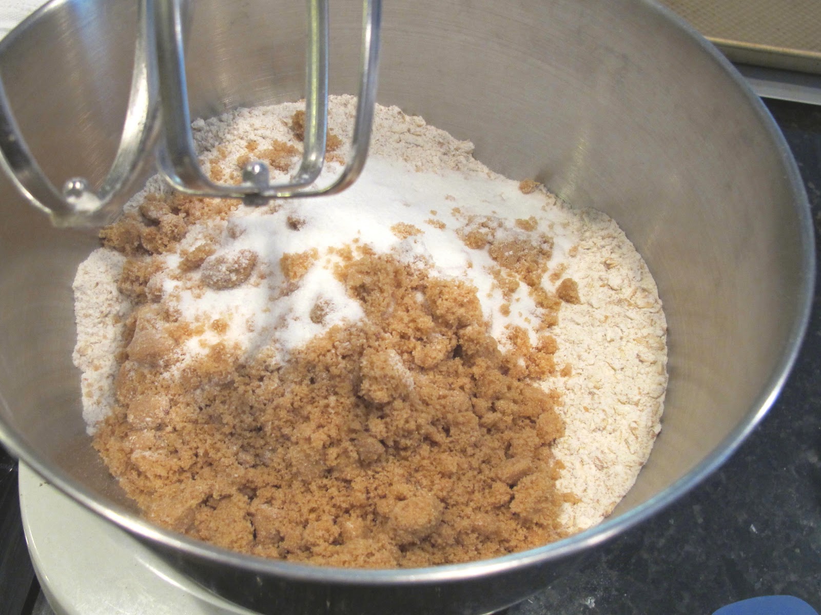 Sift flours, baking powder, baking soda, salt, cinnamon and nutmeg until fully incorporated. Add oats and sugars.